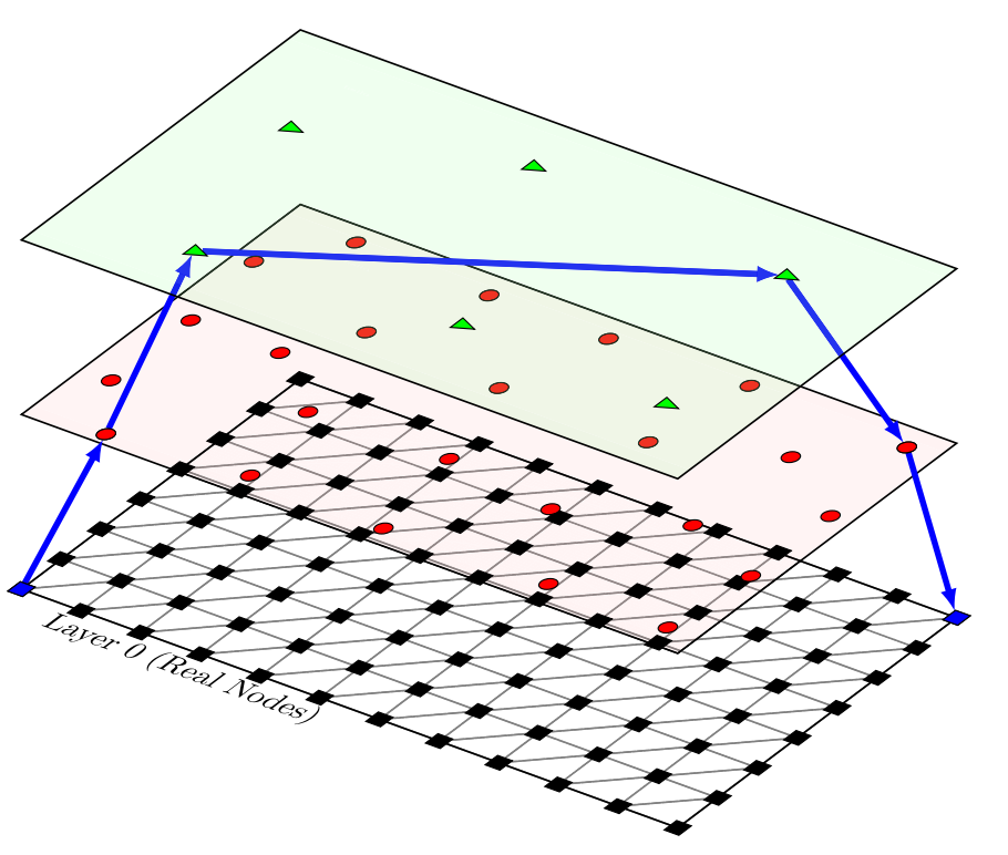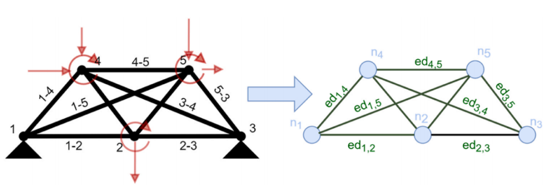 图:简单特拉斯结构的图形表示示例:荷载条件为红色,起始结构模型为黑色,图形表示中的节点和边分别为蓝色和绿色。