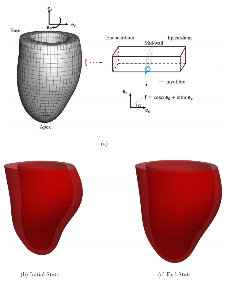 图(a)显示了左心室的六面体FE网格结构以及RBM生成的肌纤维场,其中肌纤维方向从心内膜到心外膜平滑变化。图(b)显示了初始参考配置中示例左心室几何结构的心内膜和心外膜表面。面板(c)显示了模拟后变形的LV几何形状