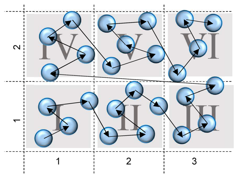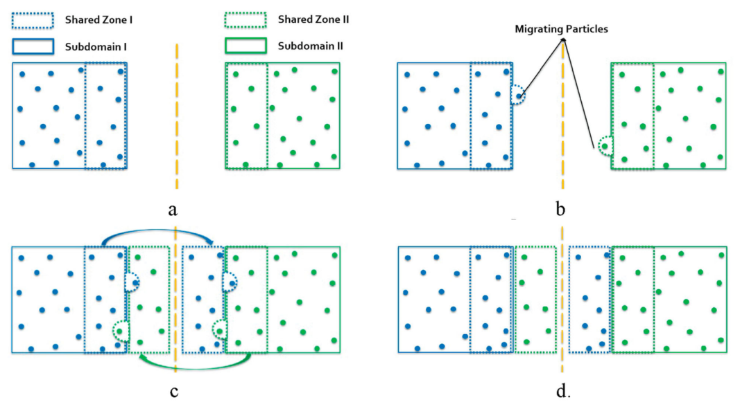 图:重新索引技术以适应迁移的粒子(a)初始粒子位置(b)移动后的粒子位置(c)共享粒子(d)通过循环所有细胞重新索引粒子。
