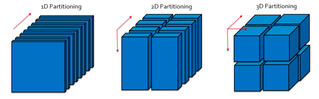 图:用于8个处理器上的立方域的1D、2D和3D划分策略。