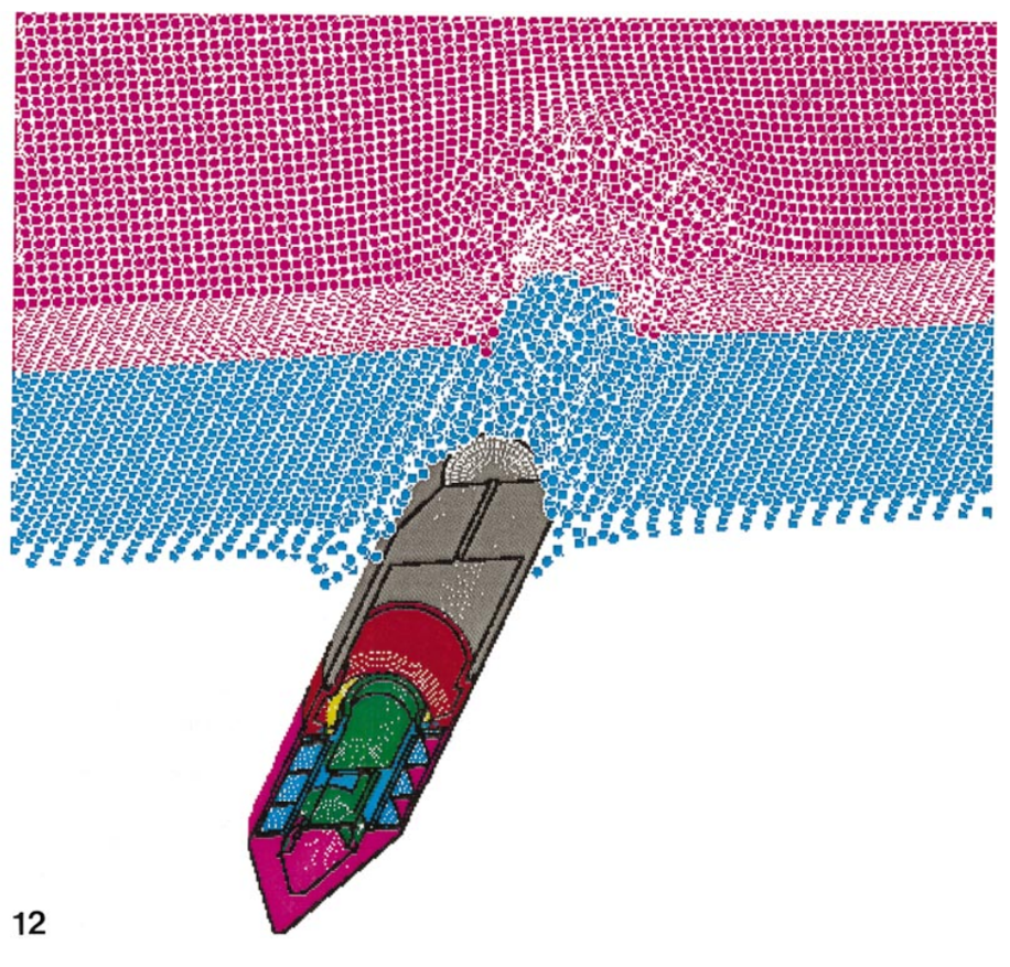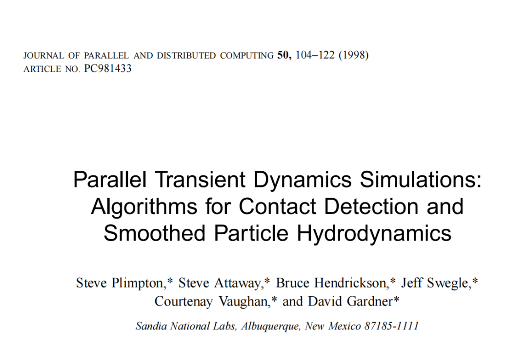 瞬态动力学模拟通常用于模拟诸如车祸、水下爆炸以及船舶集装箱对高速撞击的反应等现象。在这样的模拟中,物理对象通常用拉格朗日网格来表示,因为网格在物体承受应力时可以随物体移动和变形。模拟中的流体(汽油、水)或类流体材料(土壤)可以用光滑粒子流体力学技术进行模拟。在大规模并行处理机计算机上实现混合网格/粒子模型带来了一些困难的挑战。一个挑战是同时并行和负载平衡计算的网格和粒子部分。第二个挑战是在模拟过程中有效地检测变形网格内部以及网格单元和颗粒之间的接触。这些接触传递力的网格元素和粒子,必须计算在每个时间步骤,以准确地捕捉物理的兴趣。本文介绍了光滑粒子流体动力学和接触检测的新的并行算法,它们具有几个共同的关键特征。此外,我们描述了如何将新算法与传统的并行有限元技术相结合,创建一个完整的粒子/网格瞬态动力学仿真。我们解决这个问题的方法不同于以前的工作,我们使用了三种不同的平行分解方法,一种是静态分解,另一种是动态分解,分别用于有限元分析和接触检测。我们已经在一个并行版本的瞬态动力学代码 PRONTO-3D 中实现了我们的想法,并展示了在桑迪亚基于奔腾的英特尔万亿次运算机上运行的代码的结果。