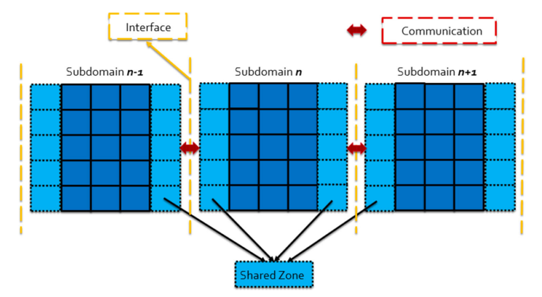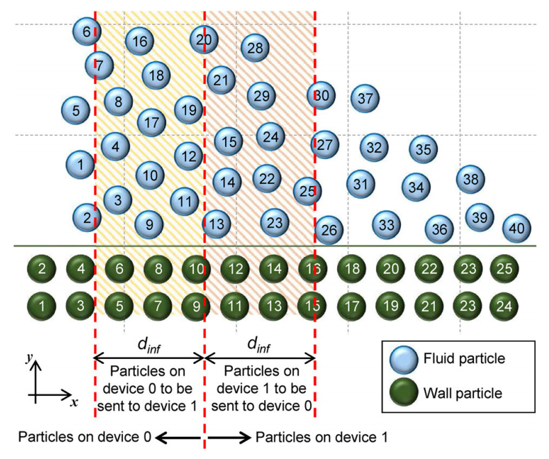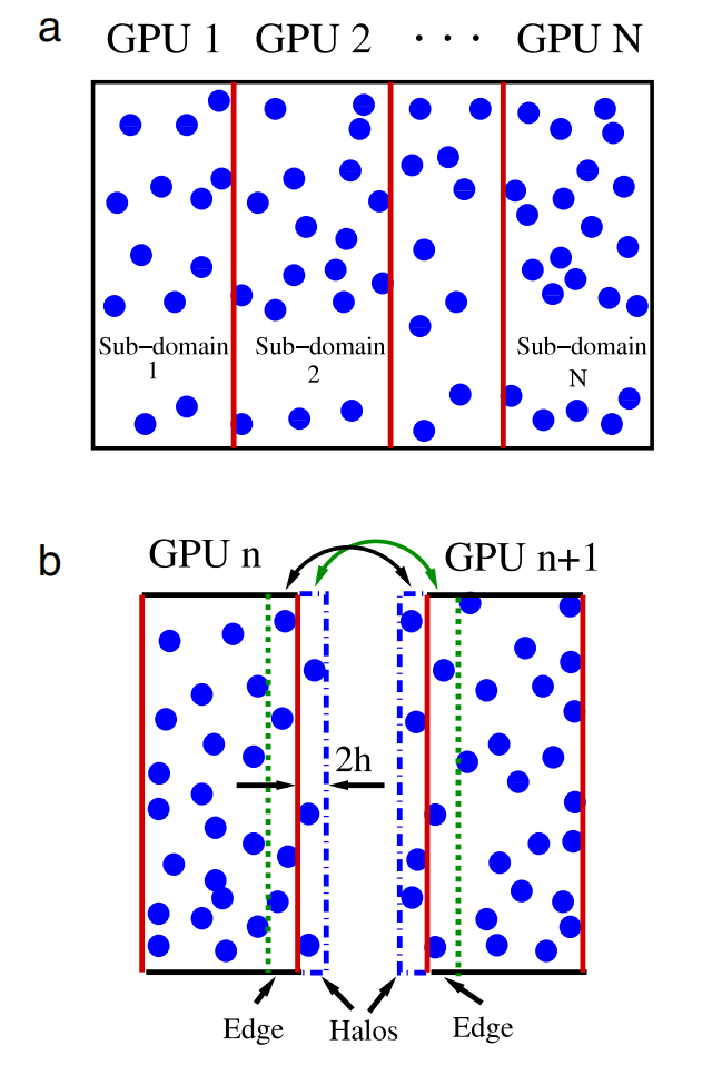 图:(a) 具有N个GPU的计算系统的一维域分解方案。总物理体积被划分为N个子域,每个子域被分配给不同的GPU。当从一个子域流到另一个子域时,以及当光环需要更新时,数据需要在GPU之间传输。(b) 处理相互作用范围内粒子动力学所需的数据(在我们的情况下,距离是平滑长度的两倍,2h)存储在子域的光晕中。