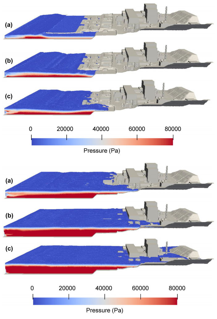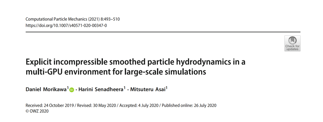 我们提出了一个具有稳定压力分布的显式不可压缩光滑粒子流体动力学公式,并在多个图形处理单元环境中实现。通过压力不变和无发散条件来稳定压力泊松方程,并使用Jacobi迭代求解器的第一步导出其显式公式。此外,我们还展示了如何将边界条件下的固定壁重影粒子应用到我们的显式方法中。该方法的验证和验证包括静水压和溃坝数值试验。与我们的单GPU实现相比,多GPU环境中的计算性能显著较高,具有合理的加速值。特别是,我们的代码允许模拟每个GPU卡上多达2亿的大量粒子。最后,为了说明我们的公式在模拟自然灾害方面的潜力,我们对2011年日本东日本大地震海啸淹没的著名福岛第一发电厂进行了模拟。