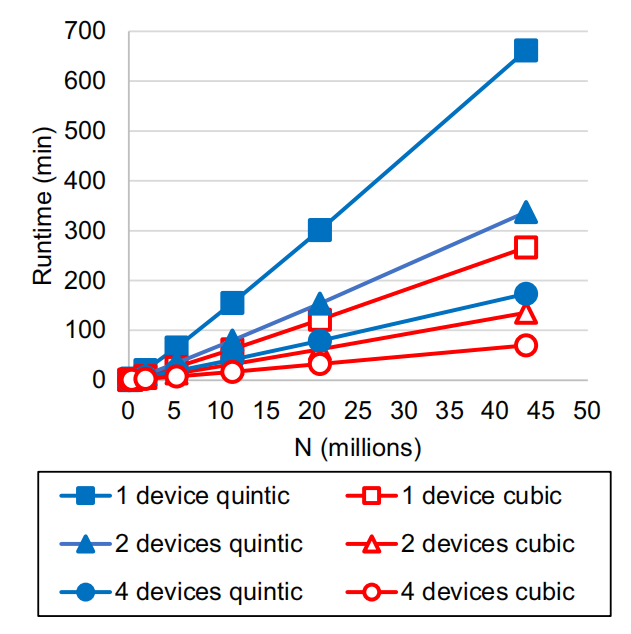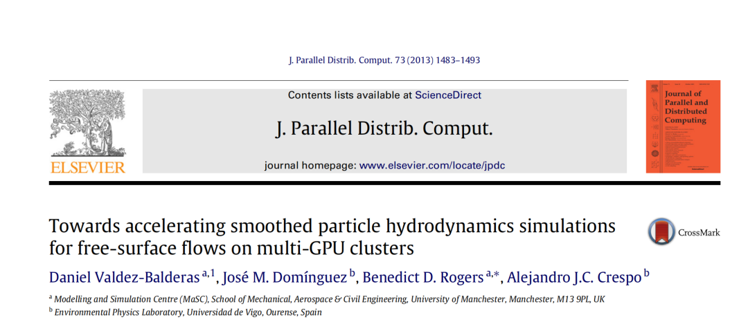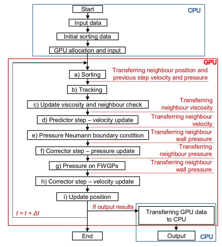 从平滑粒子流体动力学(SPH)代码DualSPHysics的单图形处理单元(GPU)版本开始,为自由表面流开发了一个多GPU SPH程序。该方法基于空间分解技术,将所研究物理系统的不同部分(子域)分配给不同的GPU。设备之间的通信是通过使用消息传递接口(MPI)应用程序编程接口(API)例程来实现的。详细描述了排序算法基数排序在GPU粒子间迁移和子域“halo”构建(实现不同子域的SPH粒子之间的相互作用)中的使用。一方面,利用由此产生的方案,可以进行也可以在单个GPU上执行的模拟,但现在可以比单独在这些设备中的一个上更快地执行模拟。另一方面,在当前架构上,可以使用多达3200万个粒子进行加速模拟,由于内存限制,这超出了单个GPU的限制。对弱和强缩放行为、加速和生成程序的效率进行了研究,包括阐明计算瓶颈的研究。最后,讨论了在我们的方案的未来版本中减少开销对计算效率影响的可能性。