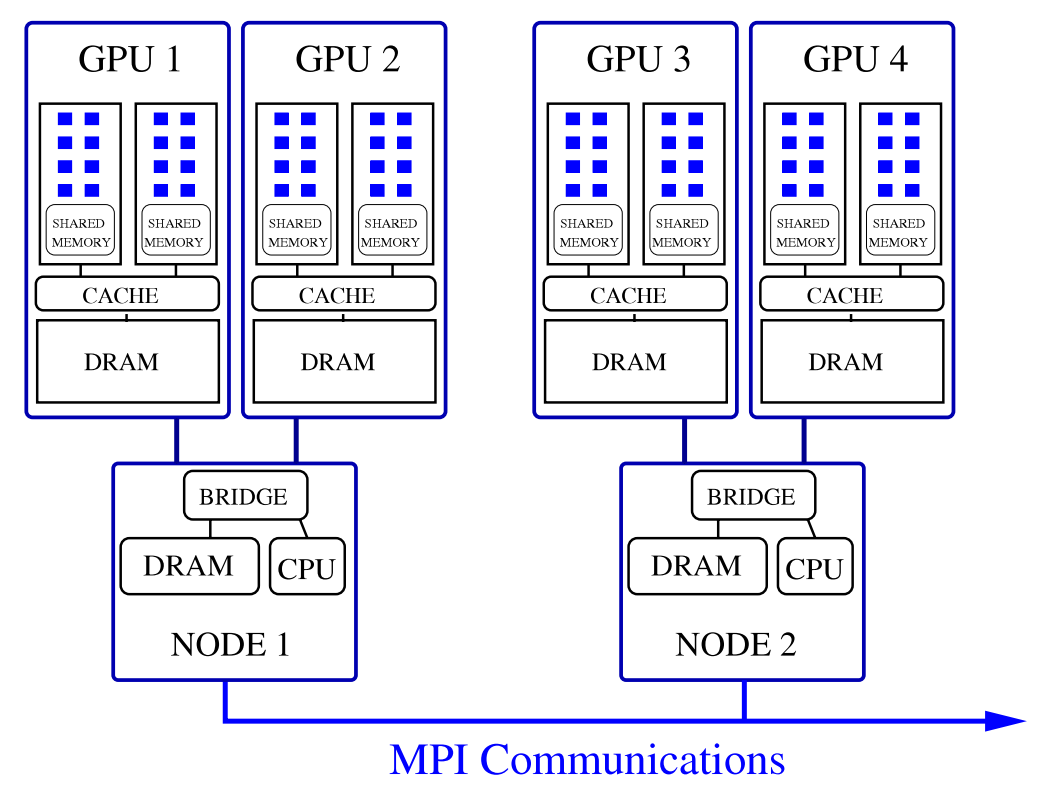 图:具有两个节点的多GPU系统的图示,每个节点承载两个GPU。更一般地,多GPU系统由一个或多个计算节点组成,除了一个或更多个CPU之外,每个计算节点还托管一个或更多个GPU。不同的节点通过计算机网络技术连接,并通过MPI进行信息传输。