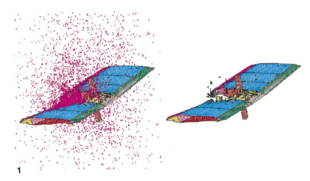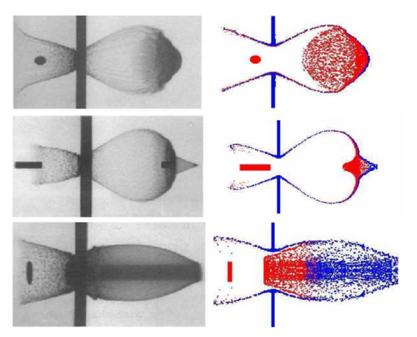 图:三种不同形状的投射物高速撞击锌板时产生的碎片云。