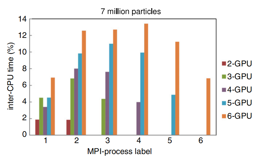 图:每个MPI进程用于使用不同数量的GPU进行模拟的CPU间通信的时间百分比。横轴对应MPI过程的标签。较小的时间对应于分配给模拟框端点的过程,如文中更详细的解释。