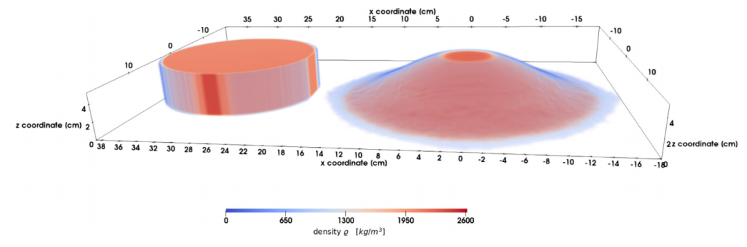 图:颗粒柱的引力坍缩。SPH密度显示在左侧初始状态和右侧最终状态的体积渲染图像中。半径和高度之间的初始比值为a=0.55。