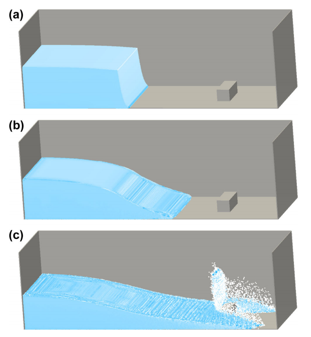 图:使用EISPH模拟有障碍物溃坝的粒子视图。