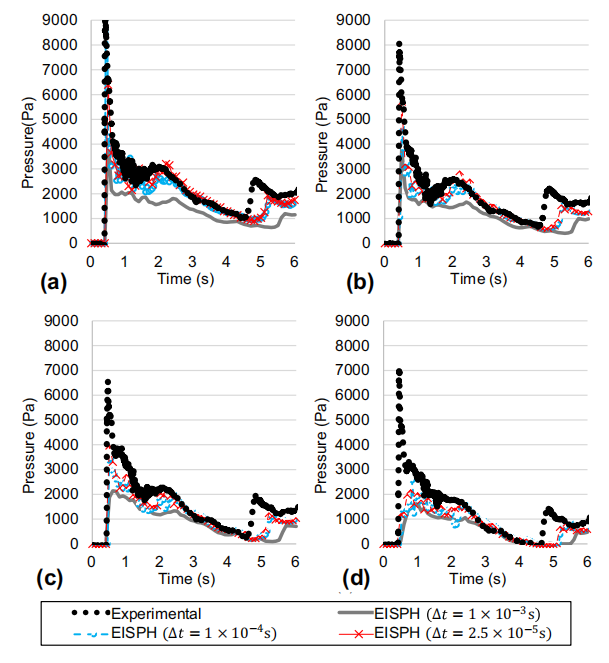 图:a P1、b P2、c P3和d P4有障碍物的模拟溃坝图形结果