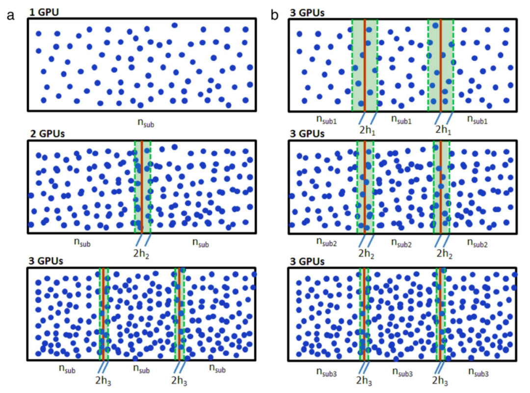 图:(a) 每个GPU固定数量的粒子nsub和增加数量的GPU的域分解方案,对应于弱缩放。(b) 对于给定数量的GPU(本例中为三个),可以显示光晕nhalo中粒子与nsub的比例降低,从而获得更好的缩放效果,如图所示。