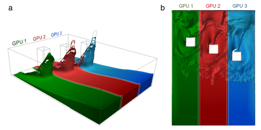 图:使用三个GPU的多GPU SPH模拟快照,用于具有三个障碍物的溃坝。不同子域中的流体部分以不同的颜色显示,子域边界附近的白线对应于光晕。