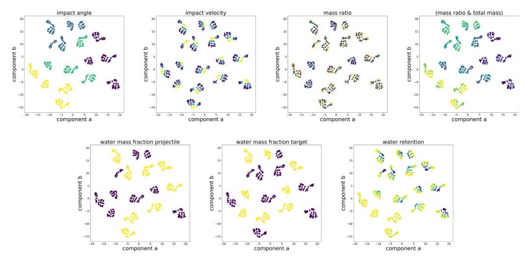 图:为了可视化,使用UMAP将六维输入空间嵌入到二维分量a和分量b中。图的标题表示各自的颜色编码。请注意,只有保水性色标表示评估碰撞结果后的结果,其他色标表示初始条件。
