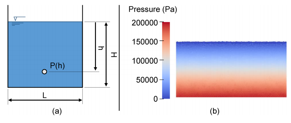图:a流体静力问题的几何参数,以及b由此产生的模拟粒子视图。