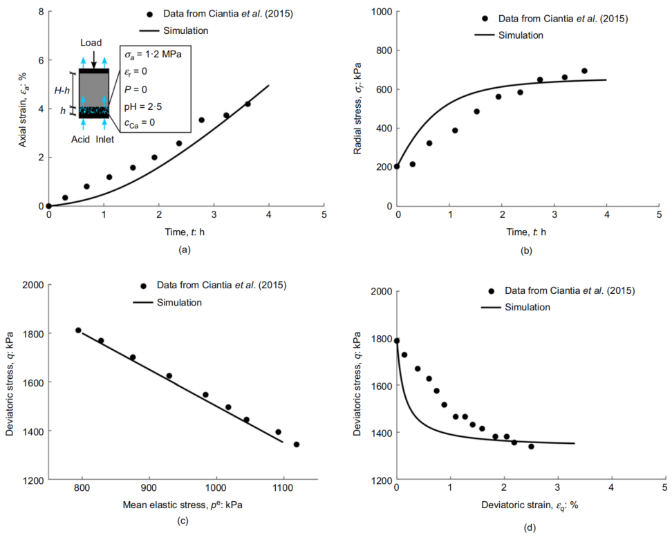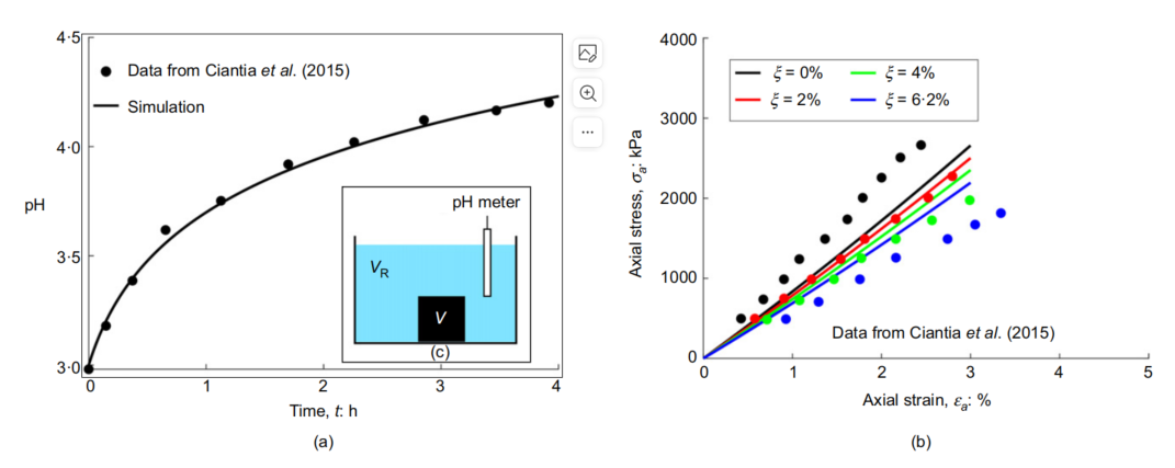图:基于非耦合长期脱粘(LTD)试验的模型参数校准:(a)酸浸泡阶段的pH演变;(b) 不同化学溶解程度下的压缩行为;插图(c)实验装置。