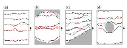 图:(a)基底配置、(b)凹形边界、(c)倾斜边界和(d)嵌入圆柱体的小主应力有限元特征线(红色虚线)和压实带位置(黑色实线)的比较。请注意,压实带的位置是快照,带的第一个位置出现在实验配置的底部,箭头指示带的传播方向。