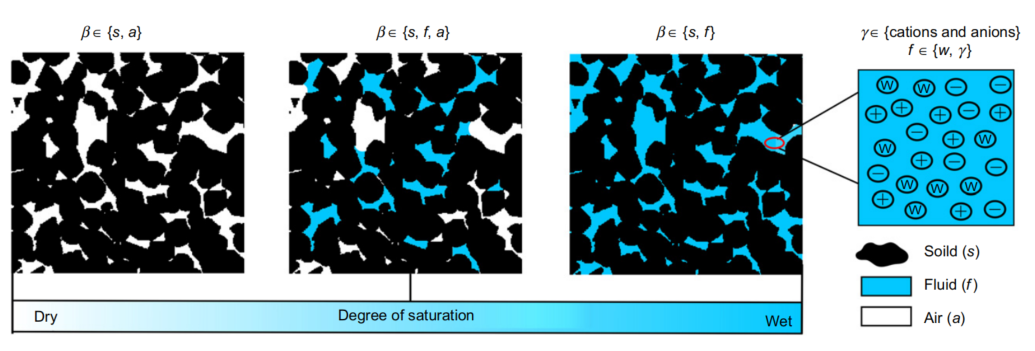 沿固体骨架和孔隙流体之间界面的化学溶解往往会改变岩土材料,并可能导致灾难性失效。根据流体动力学程序,这项工作开发了一个数学上严格且热力学上一致的建模框架,以研究化学-机械耦合对多孔弹性岩土材料本构特性的影响。该公式将孔隙流体中所有离子物种的质量分数视为量化化学过程的独立状态变量。从热力学原理、对称性要求和守恒定律系统地推导了本构关系和输运关系。为了证明其有效性,采用该配方研究了饱和钙质芳烃在酸性环境下的溶解过程。正在考虑简单的密度相关线性弹性,从而根据密度变化来物理地捕捉刚度退化。在没有化学反应的情况下,刚度是固定的,响应是纯线性的“孔隙弹性”。然而,在反应时,密度发生变化,因此刚度也发生变化,这意味着非线性反应。该模型还揭示了密度与化学势和孔隙流体压力的关系,并表明后者受密度和渗透浓度的控制。在非耦合和耦合测试条件下,对钙屑岩样品长期脱粘测试的模拟与实验观察结果吻合良好。此外,仅考虑有限数量的明确假设,该模型恢复了几个经验定律的形式,如达西定律、菲克定律和反应动力学定律。在这些理想化的模型假设之外,新推导的关系概括了现场条件的结果,并提供了对通常没有或由于具有挑战性的载荷和边界条件而在技术上无法可靠地获得实验数据的情况的见解。