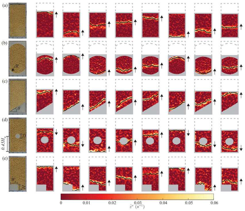 图:压实带传播过程中随时间变化的实验几何形状(第一列)和相应的体积应变速率场。