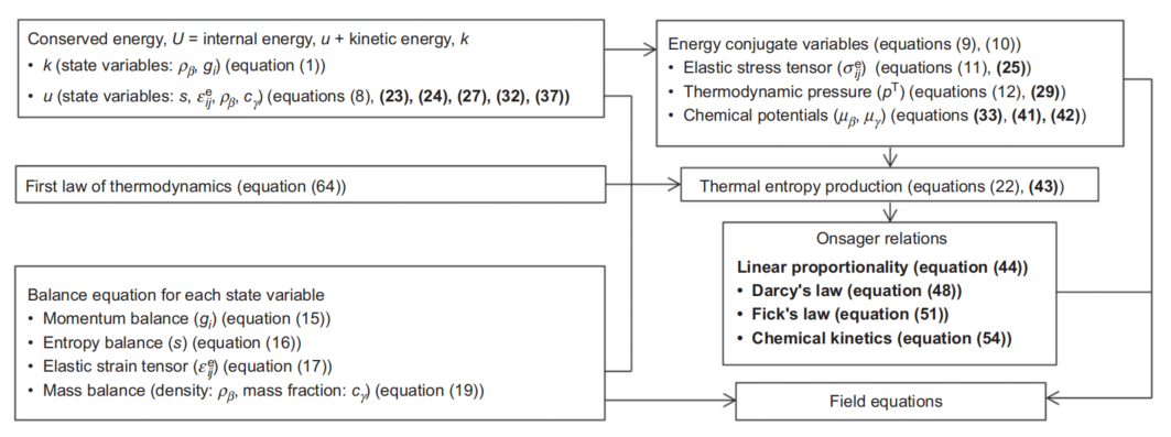 图:表示理论推导的流程图。规则字体表示一般的流体动力学公式,而粗体字体表示型号规格。左边的方块描述了一般物理,而右边的方块是基于流体动力学推导得出的