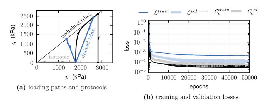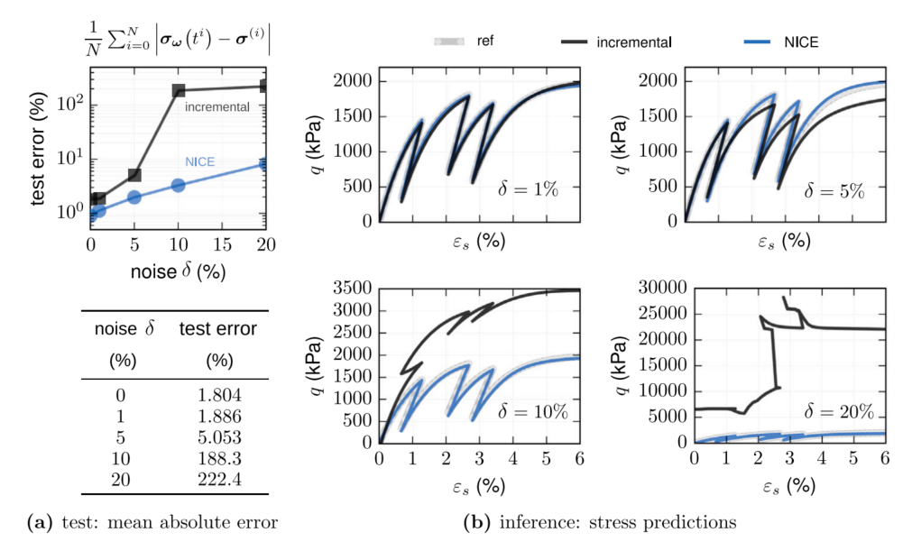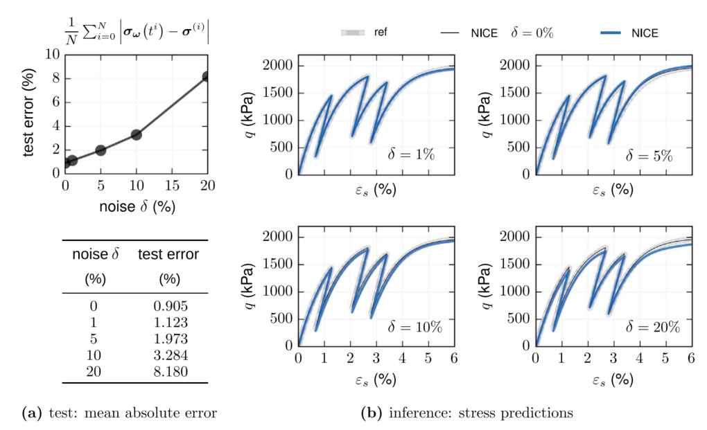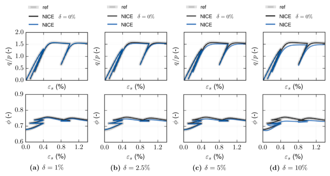 图:损坏的训练数据对密集取样固体百分比的影响: 用随机加载方案对不排水三轴的应力比和固体百分比进行推断的预测。该材料的初始固相分数 φinit = 0.5,在 p (0) = 5500kPa 的围压下各向同性地压缩。合成噪声的幅值(δ)添加到应力值和状态变量组成的训练和验证集从左到右的变化