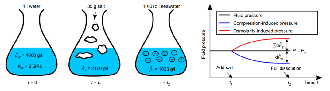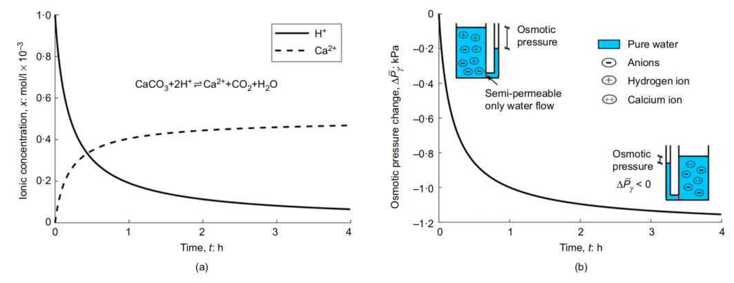 图:非偶联长期脱粘(LTD)试验酸浸泡阶段的模拟结果:(a)离子物种的浓度演变;(b) 渗透压的演变