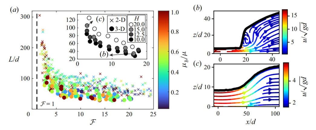 图:(a) 不同μb/μ的归一化跳跃长度L/d与弗劳德数F的关系。插图中:储罐不同开口高度(μb=0.25,μ=0.54)的所有三维周期性跳跃的示例。面板(b,c)显示了两个极端跳跃的流线(数据如(a)的插图所示):带再循环的陡坡跳跃(b)和层流跳跃(c)。