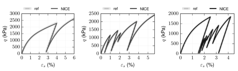 图:具有一个、四个和六个卸载-再加载循环(从左到右)的不排水循环加载路径(未观察到的情况)的推断预测。