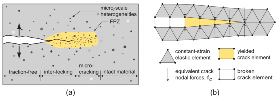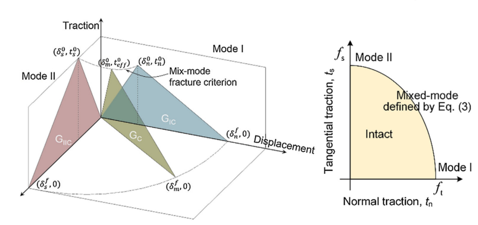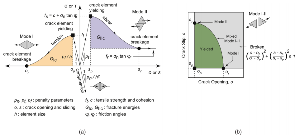 图:Irazu软件中(a) I 型和 II 型断裂模型;(b)混合型(I-II 型)断裂准则