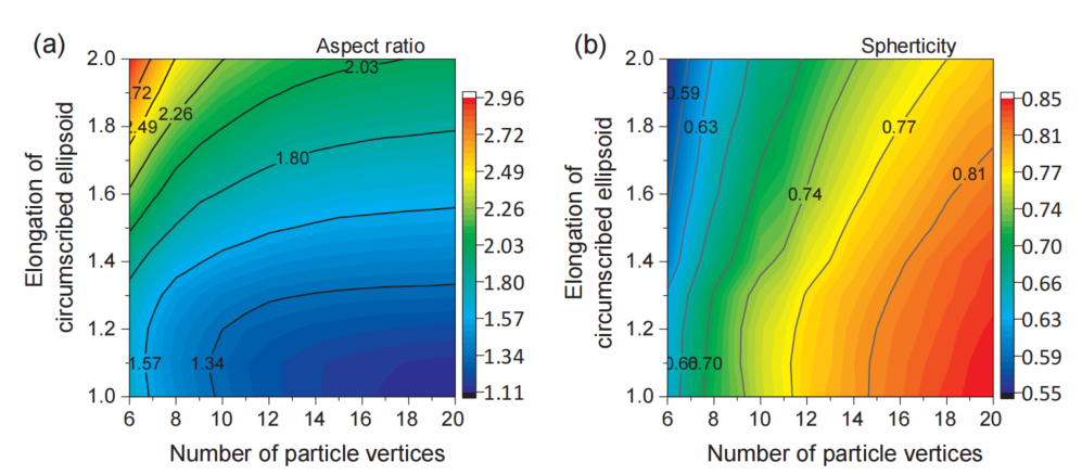 图:(a)生成的多边形粒子的纵横比和(b)球面度的等高线,作为外接椭球的延伸率和多面体顶点数量的函数。