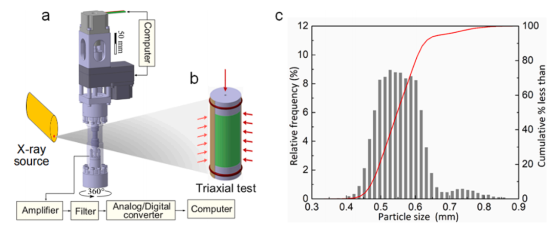 图:实验装置示意图。(a) ERDμ仪器。(b) 实验测试期间的样品。(c) 测试的渥太华砂的粒度分布。