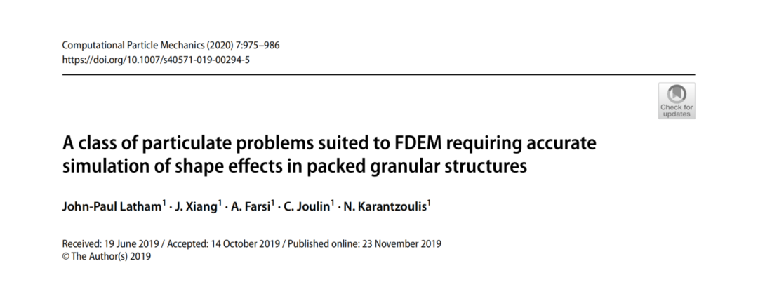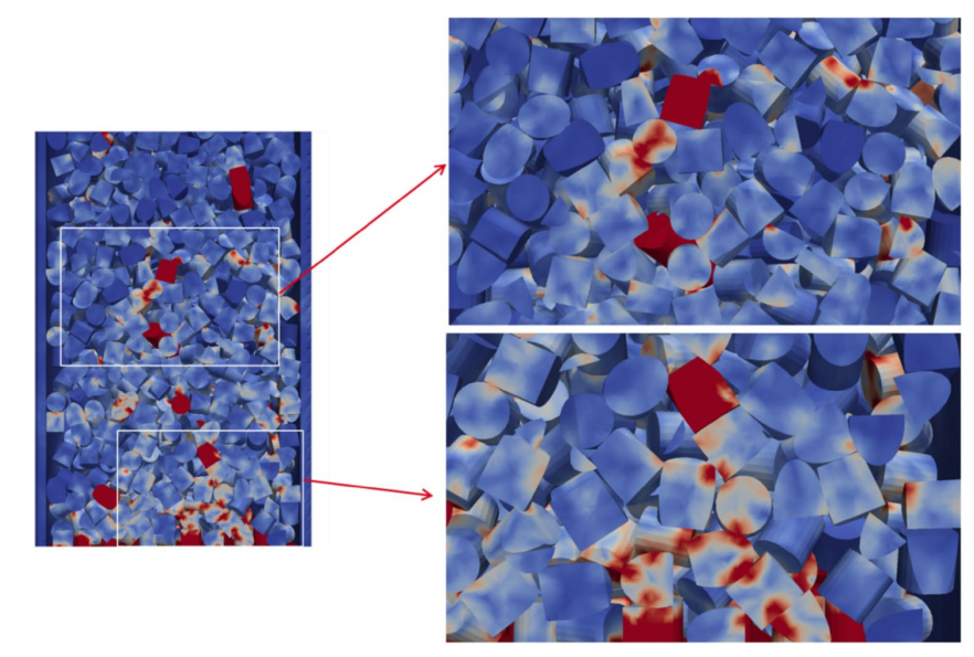 在许多颗粒材料模拟应用中,DEM能力侧重于动态固体颗粒流特性和涉及数百万颗粒的系统。关联时间是实时的几秒甚至几分钟。简化假设是为了在实际时间范围内完成运行。有一些特定的应用,通常涉及人造颗粒,其中一个代表性的包大约有一千个颗粒。因此,通常可以更准确地捕捉复杂形状的影响。需要更高的精度来建模空隙空间的拓扑结构,例如,用于进一步的CFD模拟和燃料流特性的优化。或者,精度可能对结构性能至关重要,并且要控制通过接触点的力或应力传递,以避免材料损坏和不良功能。本文简要总结了颗粒群落中填料结构形状影响的模拟方法,并将范围缩小到形状影响最受关注的问题。强调了单尺寸、单形状填料问题的两个应用:气体重整中的催化剂载体颗粒和防波堤结构中的混凝土护面单元。讨论了FDEM在粒子相对较少的填充系统中用于复杂形状粒子相互作用的明显优势。提出了一类粒子问题,即“适合FDEM”的问题,这些问题理想地由FDEM而不是DEM来解决,以供科学和工程使用。