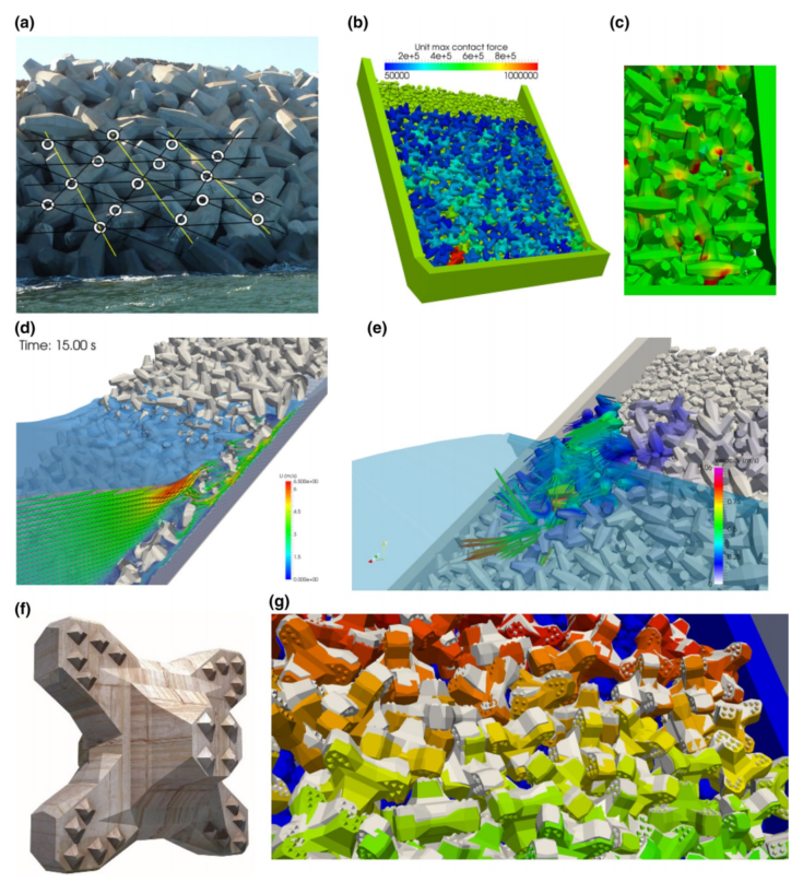 图:FDEM在防波堤稳定性预测中的应用:a具有排-柱模式的核心Loc单元的防波堤,b防波堤截面~106个单元的模型,统计最大接触力,c张应力细节,d波浪-结构相互作用序列的压力和速度时程,用IHFOAM建模,e护面单元的移动,用FDEM固体波浪代理建模,f扭王字块II™ 单位,g在风暴波序列的FDEM模型中装甲单位之前(白色)和之后(彩色)的位置。