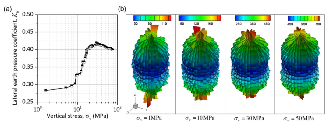 图:(a) 正常压缩过程中静止时侧向土压力系数的演变;(b) 不同垂直应力下平均法向接触力的分布。