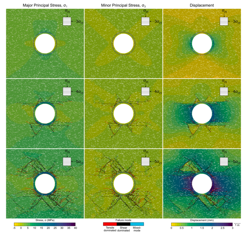 图:k=3、4和5的隧道开挖的FDEM模拟,其中每一排对应于相同的原位应力状态。