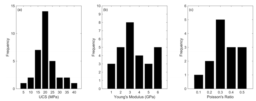 图:格鲁吉亚湾页岩测得的(a)单轴抗压强度、(b)杨氏模量和(c)泊松比分布