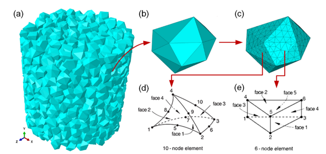 图:Odometer压缩设置:(a)由1150个颗粒组成的初始颗粒组件;(b) 单个多面体粒子;(c) 粒子的有限元离散化;(d) 十节点四面体单元;(e) 零厚度内聚界面单元(有限厚度仅用于演示目的)。