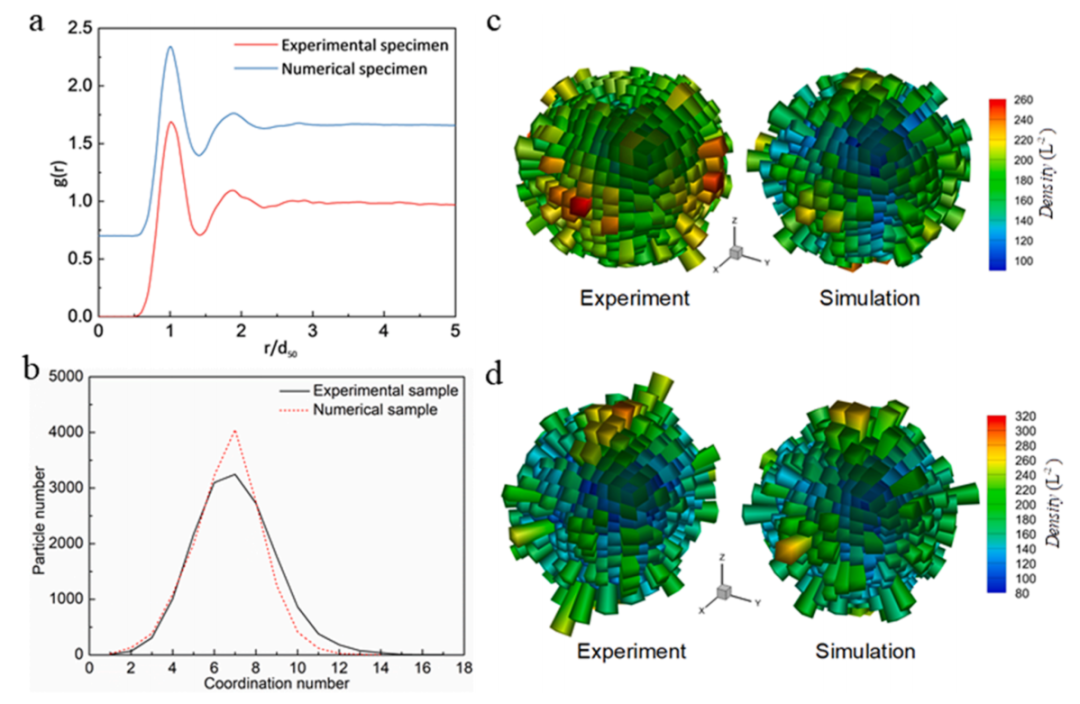 图:数值样本和实验样本的比较。(a) 为了清晰起见,将数值样本的数据对相关函数g(r)垂直偏移0.7,(b)配位数的分布,(c–d)分支向量和接触法向量的角度分布,每个角的长度和颜色分别表示在角度内定向的分支向量和接触法向量的密度。