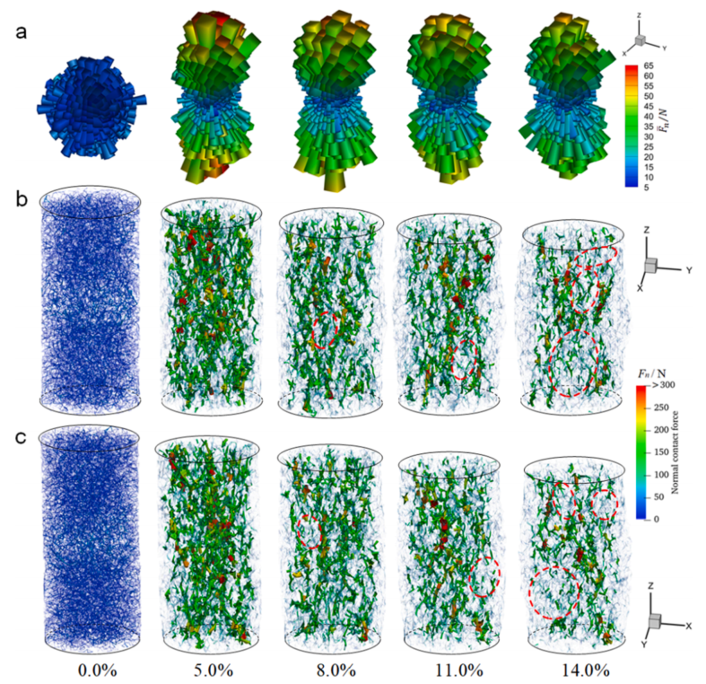图:(a) 不同应变状态下法向接触力的玫瑰图。长度和颜色分别表示在角度内定向的法向接触矢量的密度和平均法向接触力。(b–c)从不同角度观察不同应变状态下力链的空间分布,分别近似平行于X轴和Y轴。链的厚度、颜色和不透明度与接触力的大小成比例。
