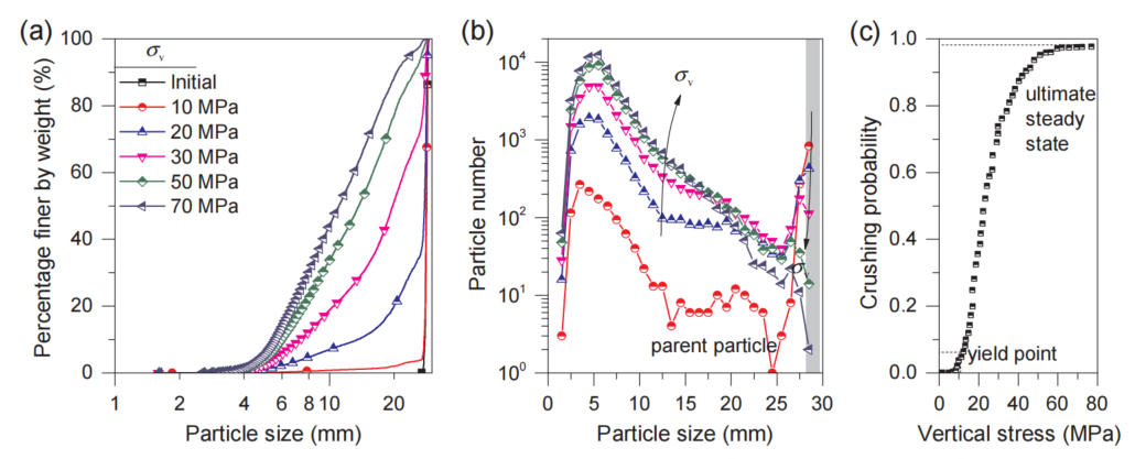 图:(a)粒径分布、(b)粒径频率和(c)不同垂直应力下母体颗粒破碎概率的演变。