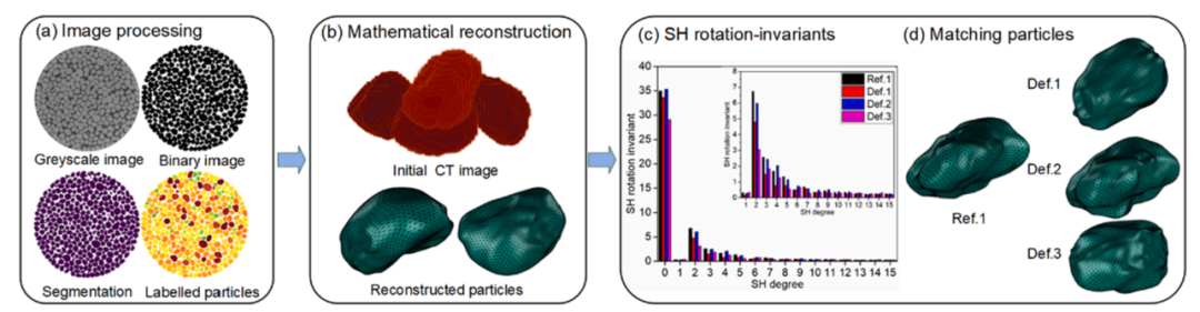 图:三维图像处理和建模的示意流程。(a) 3D图像分割的处理。(b) 基于球谐重构的粒子表面数学表征与建模。(c) 不同SH度下导出的球面谐波旋转不变量的统计差异(一个粒子来自参考(Ref.)配置,三个粒子来自变形(Def.)配置)。(d) 选定粒子的数字重建和匹配结果(粒子Ref.1与粒子Def.2匹配)。