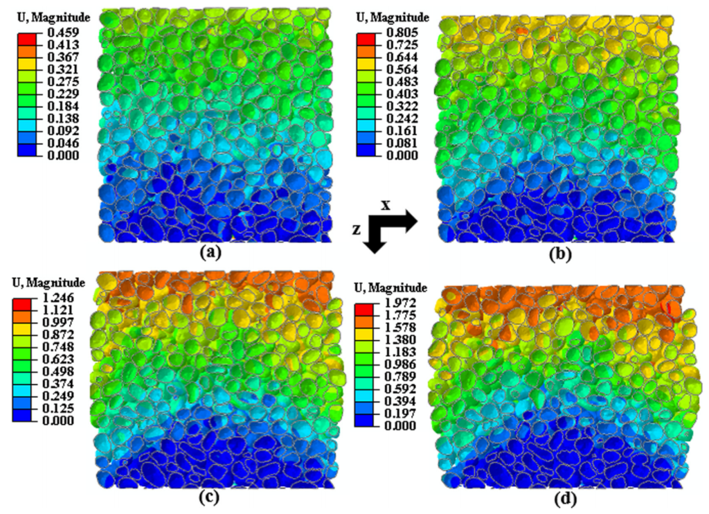 图:在140kPa围压下剪切试样期间,摩擦边界渥太华砂组件中的位移;(a) 2%的轴向应变,(b)5%的轴向应变、(c)9%的轴向应变和(d)15%的轴向应变。(在试样底部形成一个位移可忽略不计的锥形楔)(位移单位为mm)
