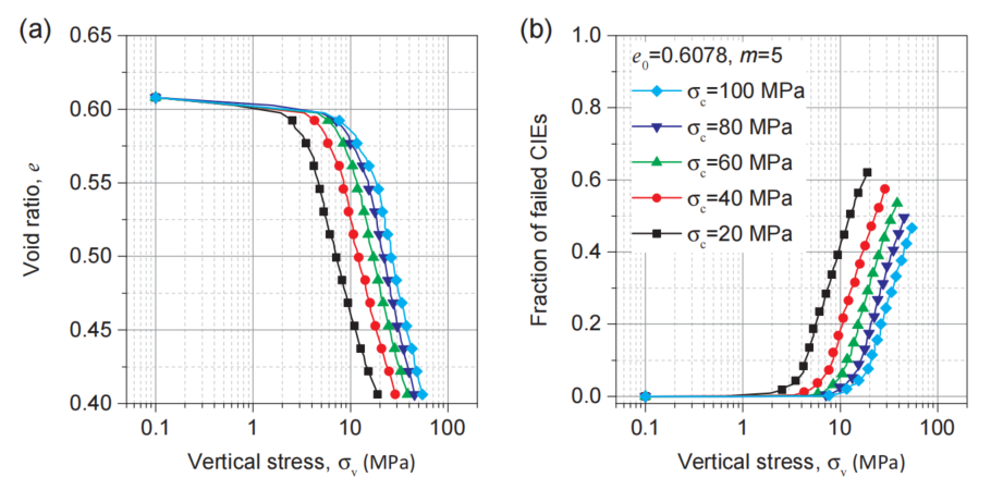 图:不同颗粒强度样品的压缩行为:(a)正常压缩线;(b) 失效CIE的占比。