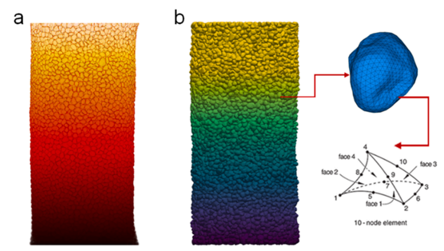 图:渥太华沙样品的重建(a)实验样品的X射线断层扫描数据的3D渲染。(b) 数值样本与有限元离散化。