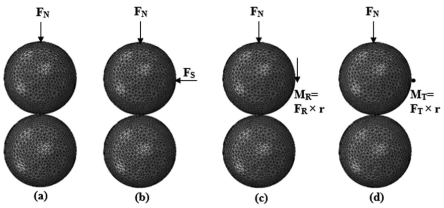 图:有限元模拟中两个相同球体在不同载荷条件下的排列:(a)法向压缩,(b)剪切载荷,(c)旋转载荷,(d)扭转载荷