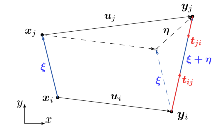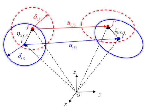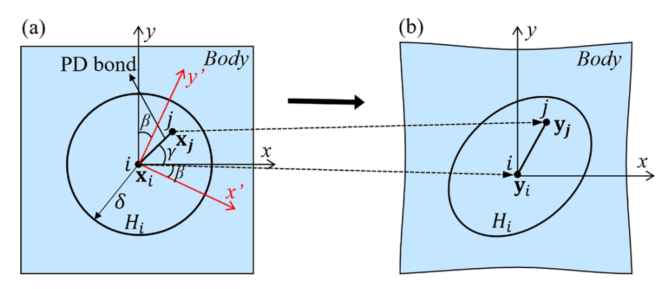 图:PD模型中材料点之间的相互作用。(a) 初始PD配置,(b)变形PD配置。