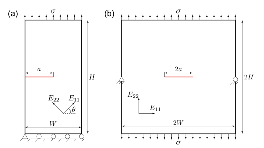 图:正交各向异性板的几何形状:(a)边缘裂纹,(b)中心裂纹。