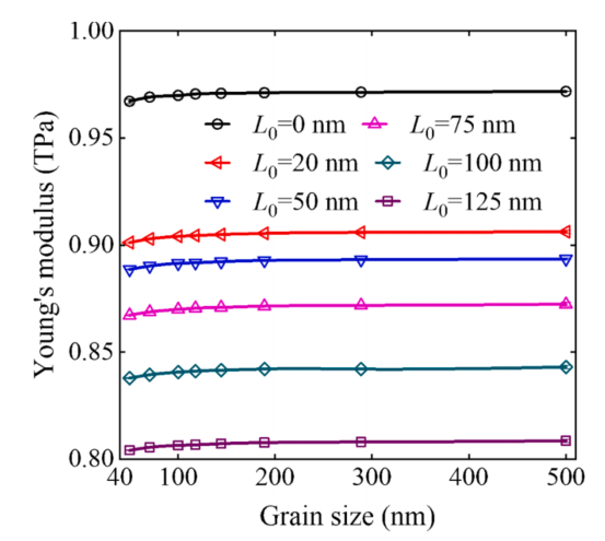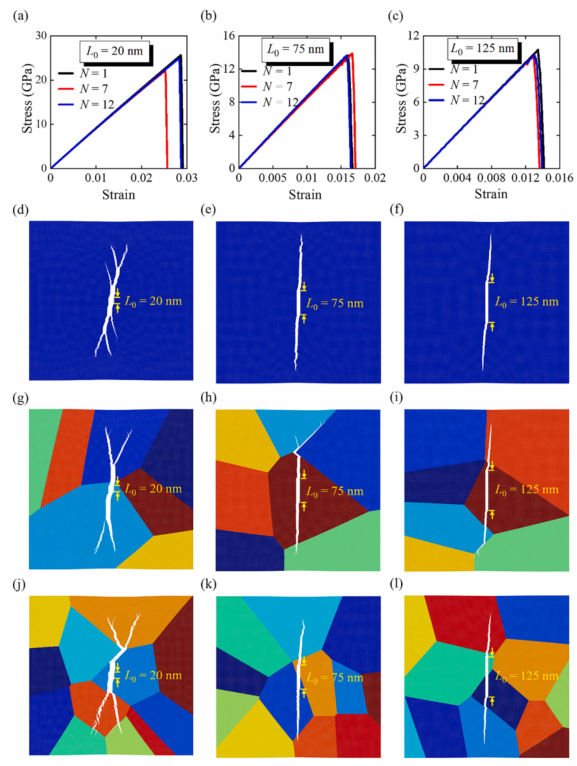 图:晶粒尺寸和裂纹前长度对石墨烯杨氏模量的影响。裂纹前长度对杨氏模量的影响大于晶粒尺寸