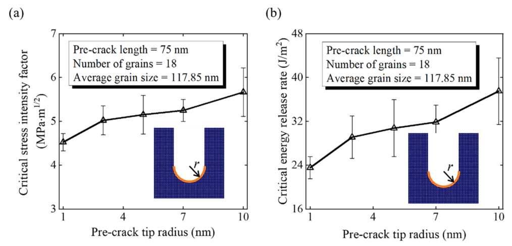 图:裂纹前尖端半径对石墨烯临界应力强度因子和临界应变能释放率的影响。裂纹前尖端越钝,断裂韧性越高。