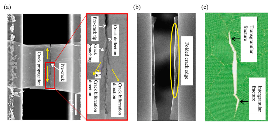 图:石墨烯在先前工作中的几种断裂形式,包括裂纹偏转、裂纹分支以及晶间和跨晶断裂