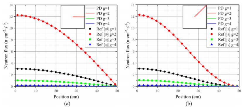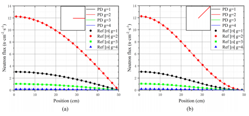 图:在具有反射和真空边界的区域中,中子引信与参考溶液的局部放电预测的比较:a水平,b对角线方向